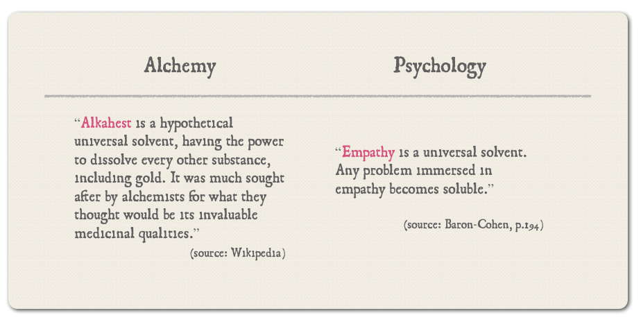 As a consequence empathy is put on a pedestal and cut off from the balance and counter-weights it needs like all other functions in nature - at least for practicing magicians that is. The hugely naive, yet central assumption of Baron-Cohen’s book and in much of the public debate is that if we all showed huge amounts of empathy any minute of the day, any type of conflict could be avoided and no one’s needs would go unnoticed. Thus empathy is turned into the latest version of the ancient alchemical Alkahest: